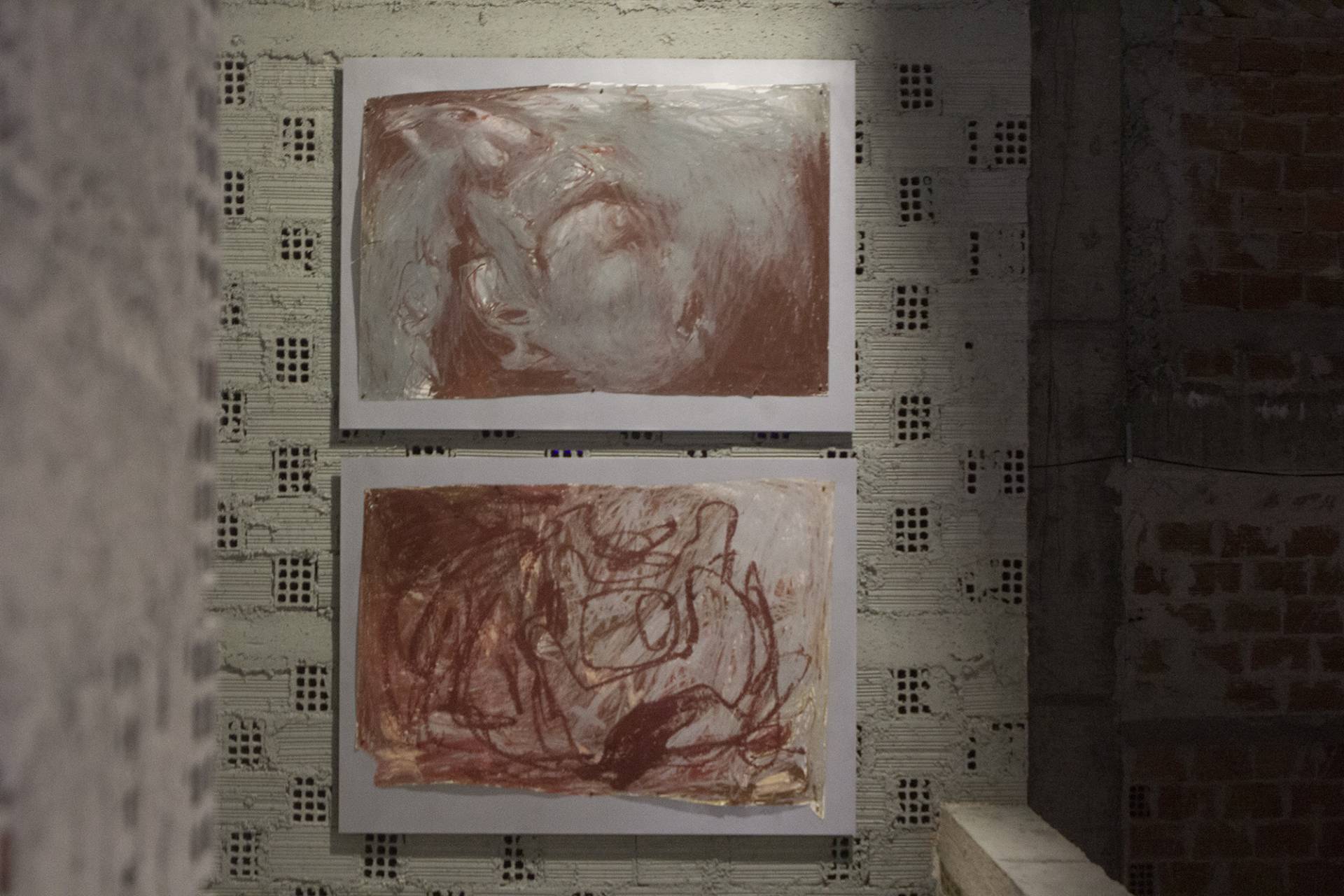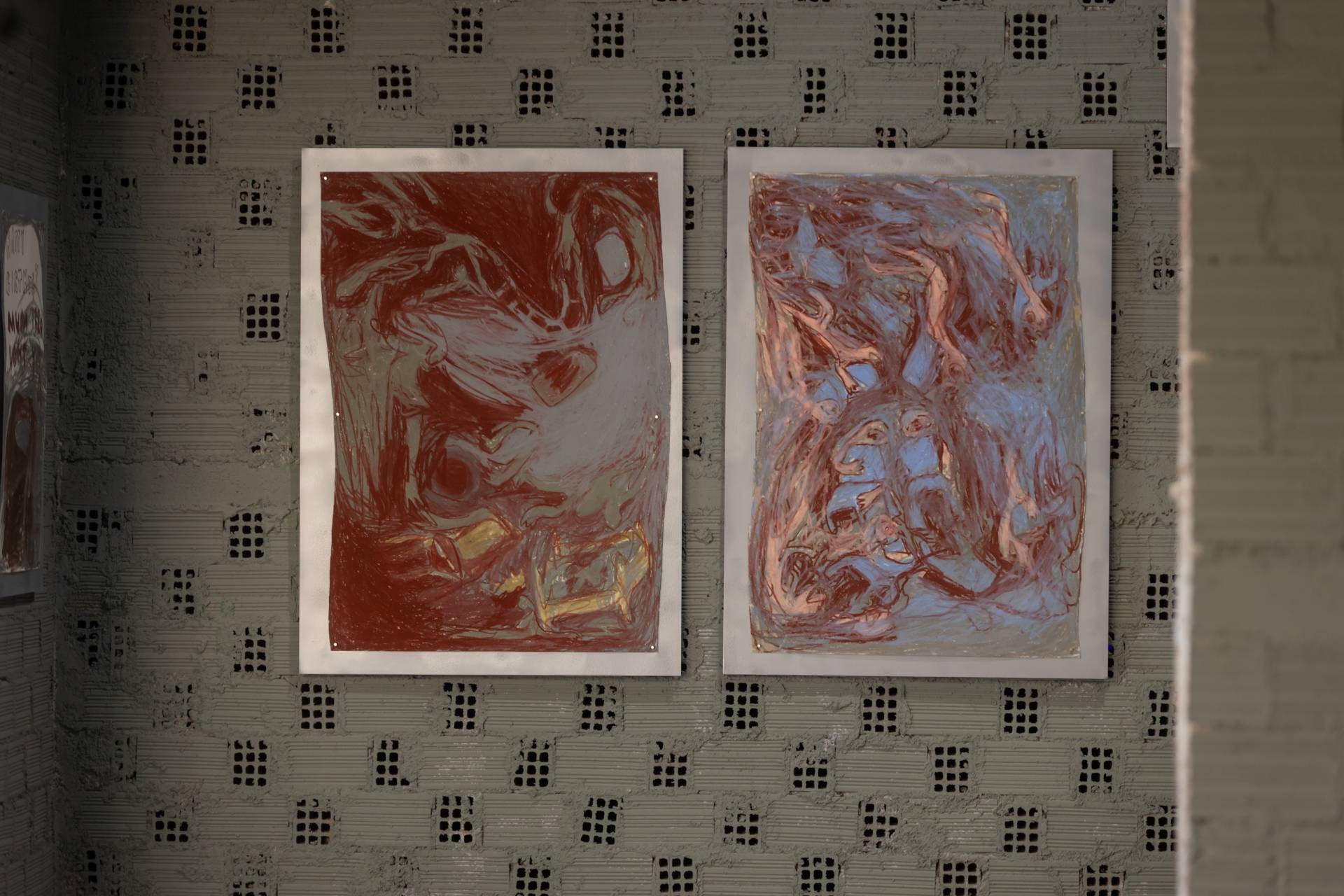 Installation view. From L to R: Untitled, 2023, oil pastel on paper, 99.5 x 70.5 cm. Untitled, 2023, oil pastel on paper, 99.5 x 70 cm.
