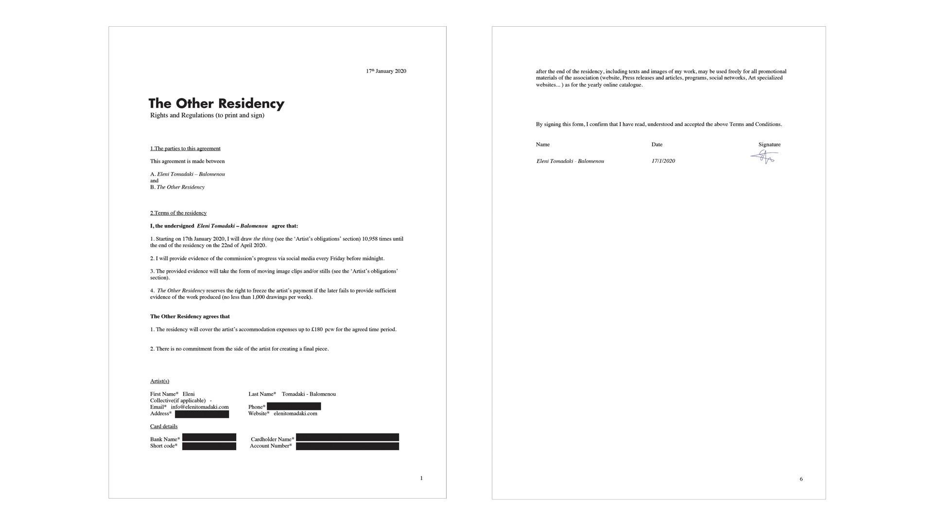 Starting on 17th January 2020, I was required to draw 10,958 sketches until the end of the residency on the 22nd of April 2020. I had to provide evidence of the commission’s progress via my IG every Friday before midnight. The provided evidences took the form of moving image clips accompanied by short texts. There was no commitment from my side to create a final piece. The curator of the residency was myself.