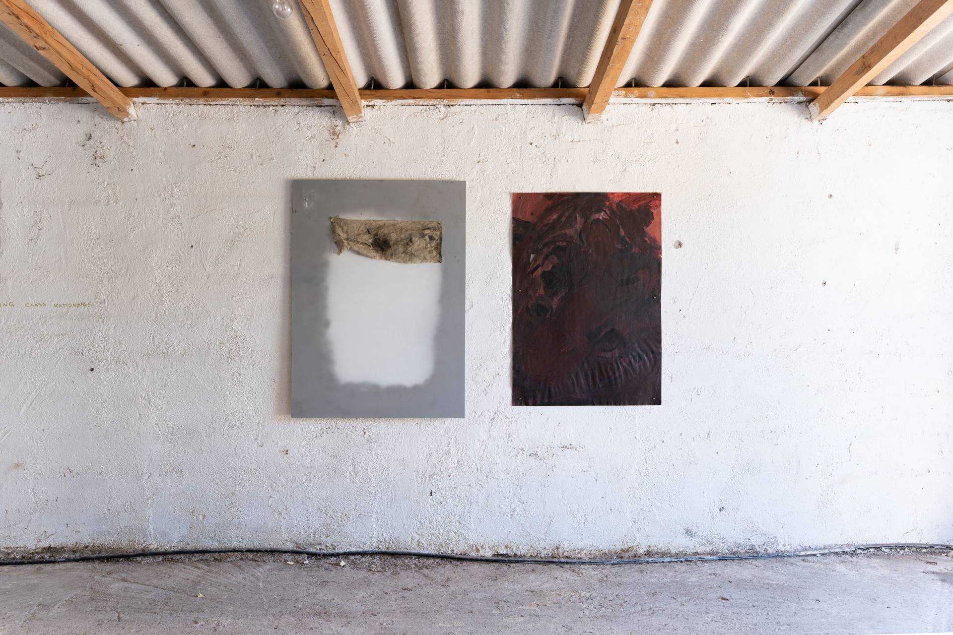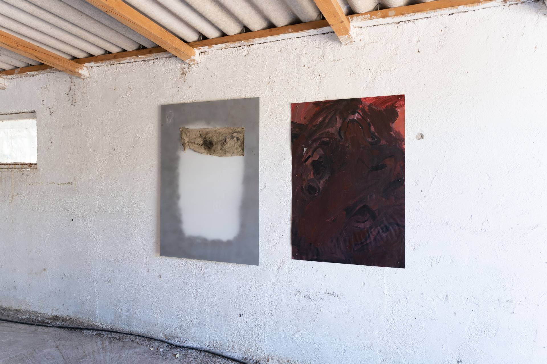Installation views - Untitled (heart), 2024, oil and graphite on linen, spray paint, aluminium, acrylic on paper.