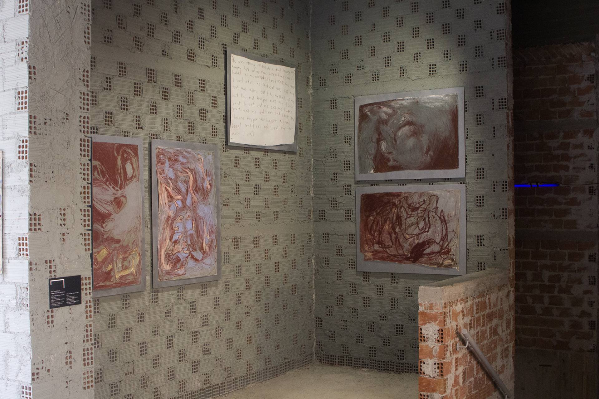 I Plead Guilty, painting installation, by Eleni Tomadaki, part of Outraged by Pleasure, curated by Nadja Argyropoulou, 'Nobel' building, Athens, 2023