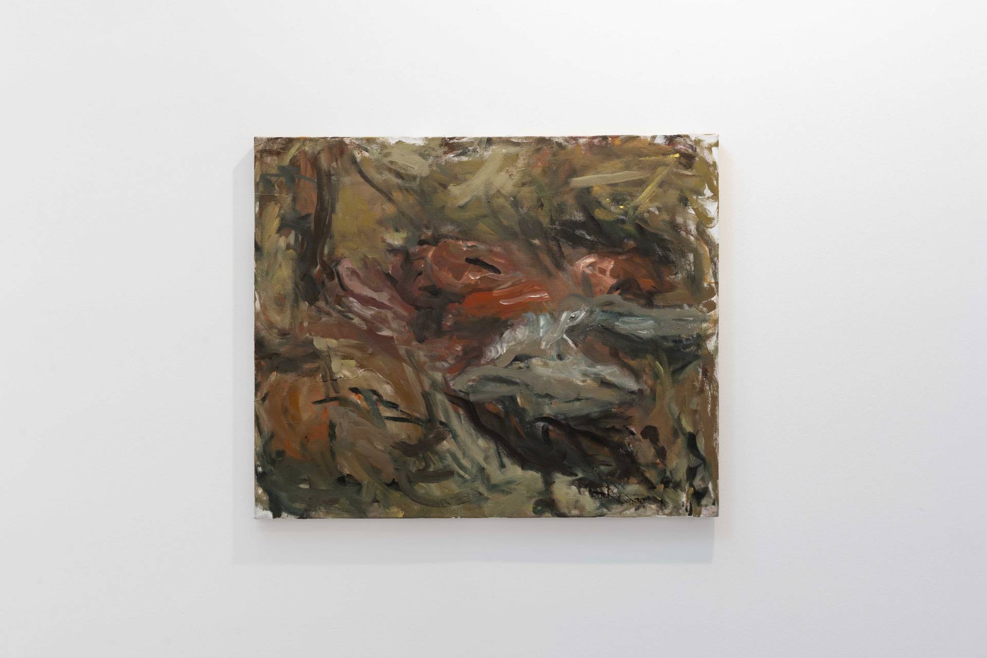 Eleni Tomadaki, I held it with both my hands slowly put it in my mouth and tried to chew it but it was tasteless spongy and wet I could not swallow it, 2025, oil on linen, 130 x 150 cm